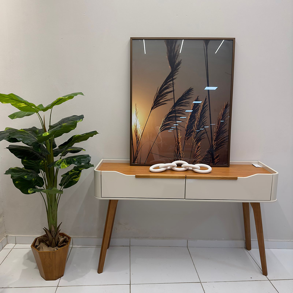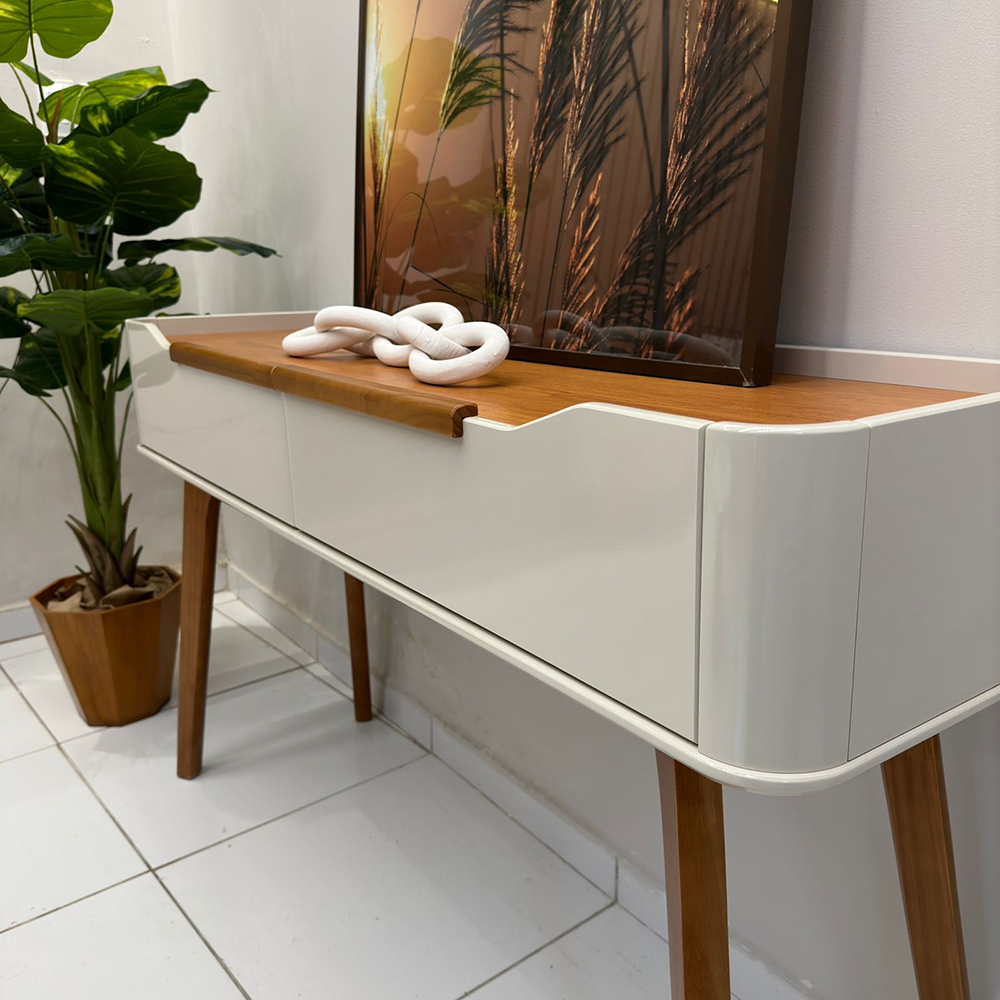 100% mdf; 2 gavetas com corrediça telescópica puxador e pés em madeira maciça